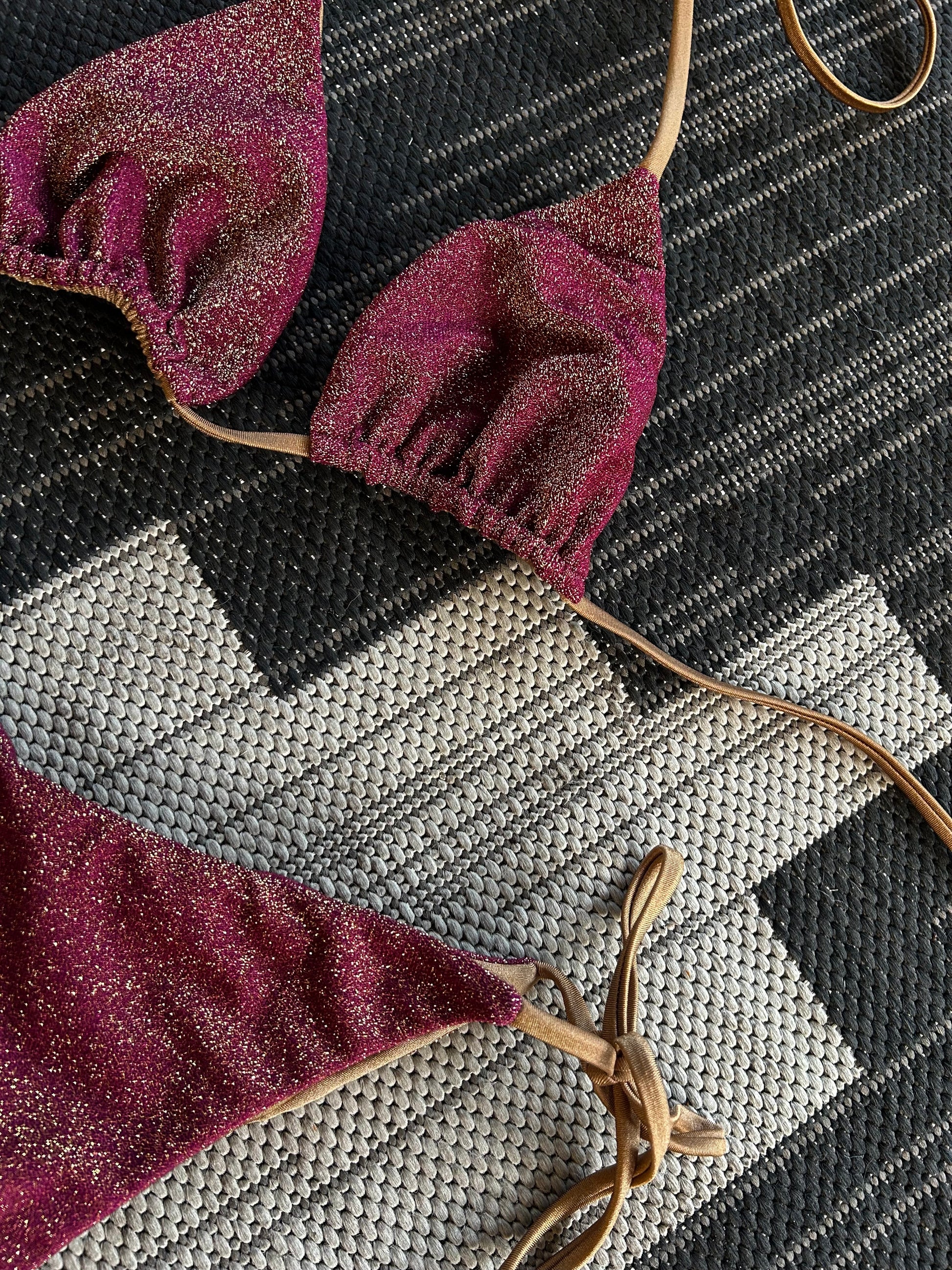 Our best selling silhouette is back- the Azusa top and Cerritos bottom will have you turning heads this season. This reversible bikini is crafted from shimmer lurex fabric on one side and a sleek solid bronze lycra on the other, giving you two effortless looks in one. The sliding triangle top lets you adjust the coverage exactly how you like it, while the tie-side bottoms create a flattering mid-rise fit that works beautifully on every body. Designed to shine in the sun and made for endless beach days, this set is equal parts timeless and striking.